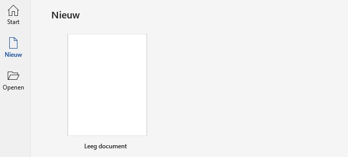 Bij het starten van Word, kom je dikwijls op de "Start" tab, bovenaan staan dan de reeds gebruikte sjablonen. Gebruik deze niet, maar verwijder ze. Zie je bij het begin de onderstaande afbeelding niet, klik dan bovenaan links op "Bestand".